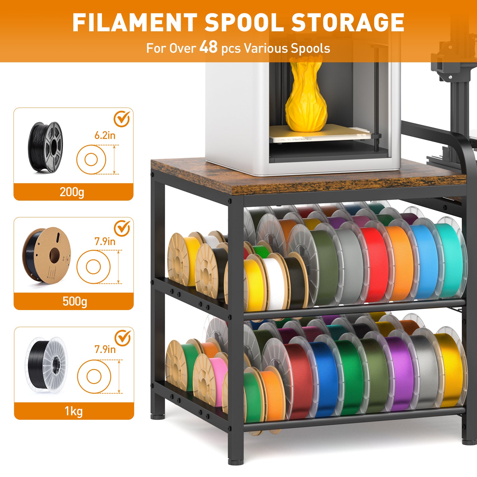 - 【Heavy-Duty Construction】Our filament rack is built to last with premium particleboard and a sturdy metal structure, with a painted surface to prevent rust and corrosion. The frame is securely locked with screws to ensure excellent stability.The tabletop can hold up to 150 lbs, while the bottom filament rack and right-side grid panel can hold up to 120 lbs, so even heavy printers and fully stocked filament racks remain firmly supported.